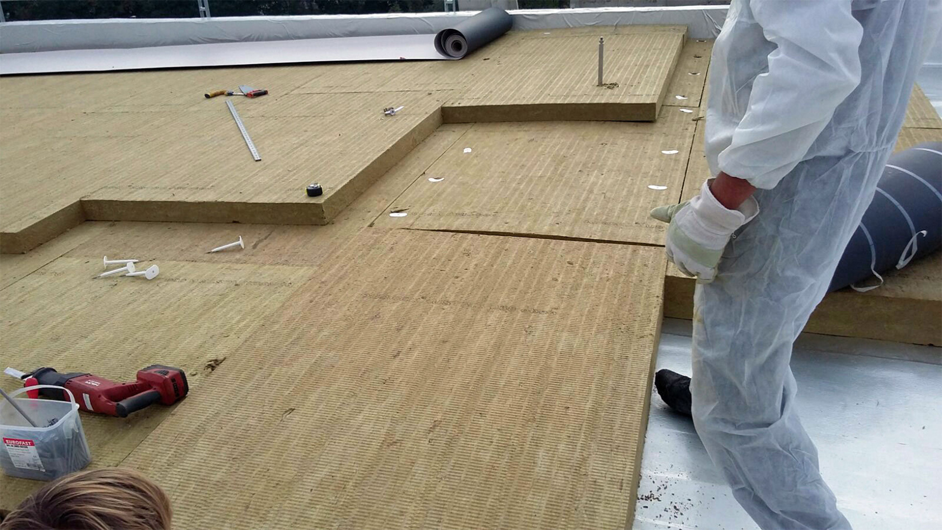 Der Neubau der Kletteranlage in Innsbruck ist hochwertig wärmegedämmt und mit einer mechanischen Lüftungsanlage mit Wärmerückgewinnung ausgestattet. Erzielt wurde Klimakategorie A, vor allem mit Durock 038 Steinwolle-Dachdämmplatten sowie durch die hinterlüftete Fassade. Als thermisch isolierende Schicht wurden dabei von der ausführenden Firma, der W. Weißbacher GmbH aus Kirchbichl, 2.250 m² Fixrock Austria 035 vollflächig verlegt. Geschäftsführer Walter Weißbacher: „Ich ziehe Steinwolle allen anderen Dämmstoffen vor.“ Steinwolle sei schrumpffrei, durchgehend wasserabweisend, diffusionsoffen und nachhaltig. „Wir verbauen sehr viel Mineralwolle, besonders im Fassadenbau.“ Im Bereich Flachdach sind 2.500 m² Durock 038 integriert – nicht brennbar, Euroklasse A1, Schmelzpunkt von über 1.000 °C, nicht glimmend, wärme- und schalldämmend, dimensionsstabil unter Temperaturänderung sowie recyclebar.