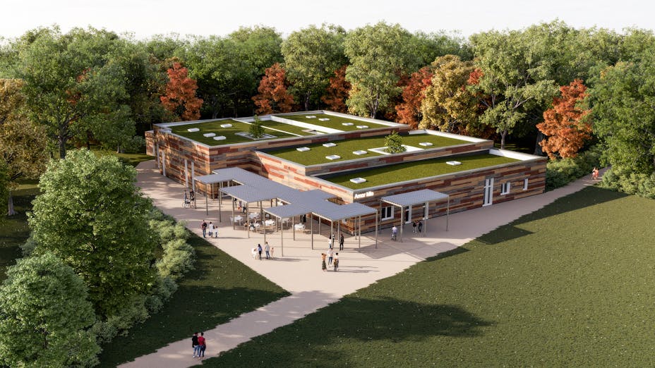 Зеленият покрив помага на центъра да се впише визуално в парка, като същевременно осигурява защита срещу натрупване на топлина и предотвратява ефекта на градския топлинен остров.