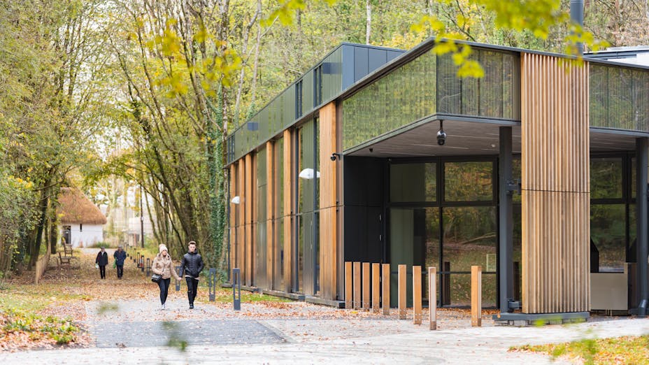 Ниско разположената сграда с прост триъгълен план е с екстериор, който се слива с парка благодарение на естествените материали и приглушената цветова палитра. За основа на външните стени са използвани изолирани сандвич панели от каменна вата. Те имат матово сиво покритие и се монтират във вертикална ориентация заедно с остъкляването, докато повтарящ се модел от вертикални дървени ивици действа като камуфлаж, за да интегрира сградата в нейния контекст.