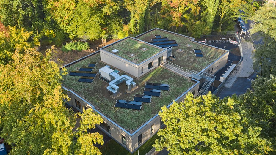 При строителството на детския център Am Holterhöfchen в Хилден, Германия, архитектите базират проекта си както върху нуждите на децата, така и върху принципа на устойчивостта в строителството. Затова избират да поставят фотоволтаична система върху плоския покрив. Като ключов компонент за плоския покрив са използвани специфичните изолационни решения от ROCKWOOL, известни с издръжливостта си на пешеходен трафик и ветрови вибрации без промяна в техническите си характеристики.
