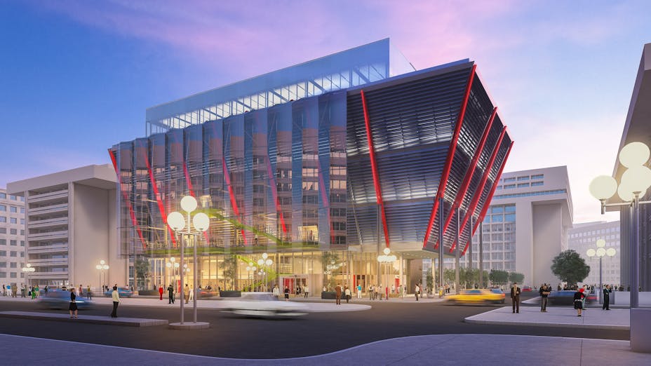 Архитектите търсят високоефективна фасадна обвивка, която да бъде подходяща за уникалните дизайнерски елементи на пространството. Експонатите на музея са скрити зад тъмна метална "черна кутия", която стои над прозрачна основа. Внушителната форма на музея, неговите мощни наклонени колони, облицовка от сгънати метални панели и нагъната стъклена обвивка се сливат в едно забележително в архитектурно отношение място.