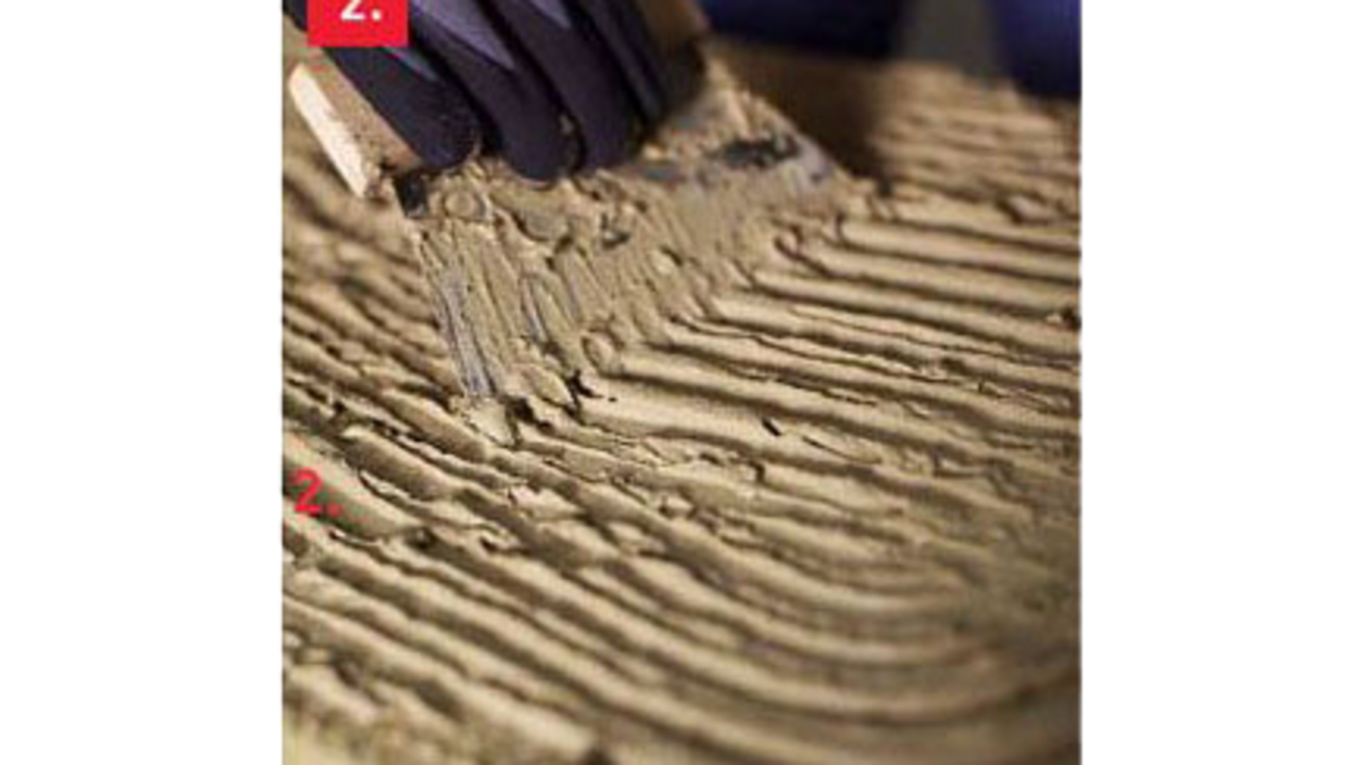 2. Conlit-betoniliima levitetään hammastetulla laastikammalla kauttaaltaan eristelevyn taustapuolelle. Varmista liiman tartunta eristelevyyn.