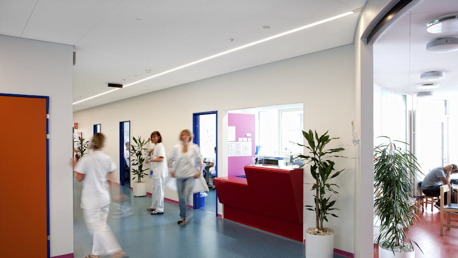 Materials have an important influence on the appearance and “feel” of a building and its interior spaces. Choosing materials that foster a comfortable, calm and aesthetically-pleasing environment helps to create spaces where people heal and recover faster. Rockfon ceilings provide sound absorption and light reflection, making rooms more comfortable to be in. And they do not support the growth of harmful micro-organisms or bacteria, contributing to creating healthy indoor environments.