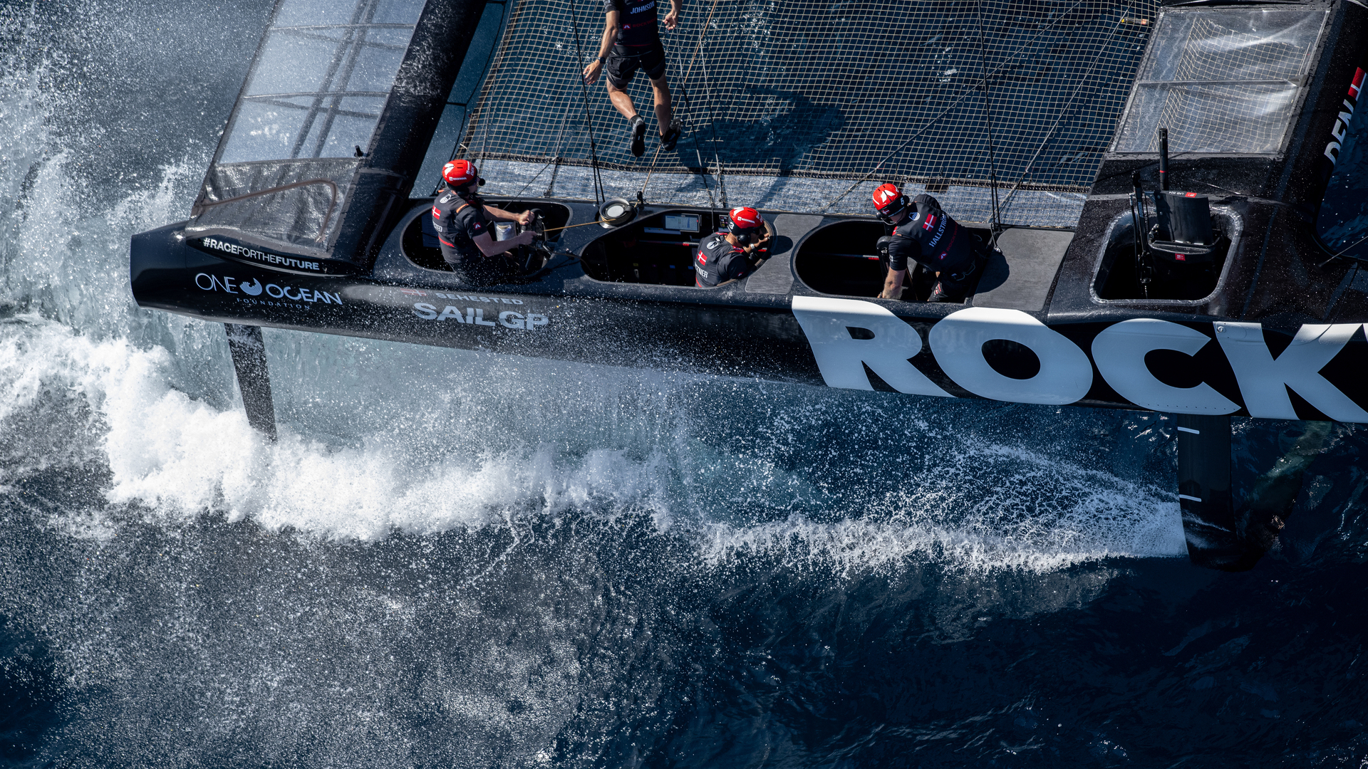 Close photo of the ROCKWOOL Denmark SailGP Team 'flying' over the water during the Saint-Tropez Sail Grand Prix in Season 4