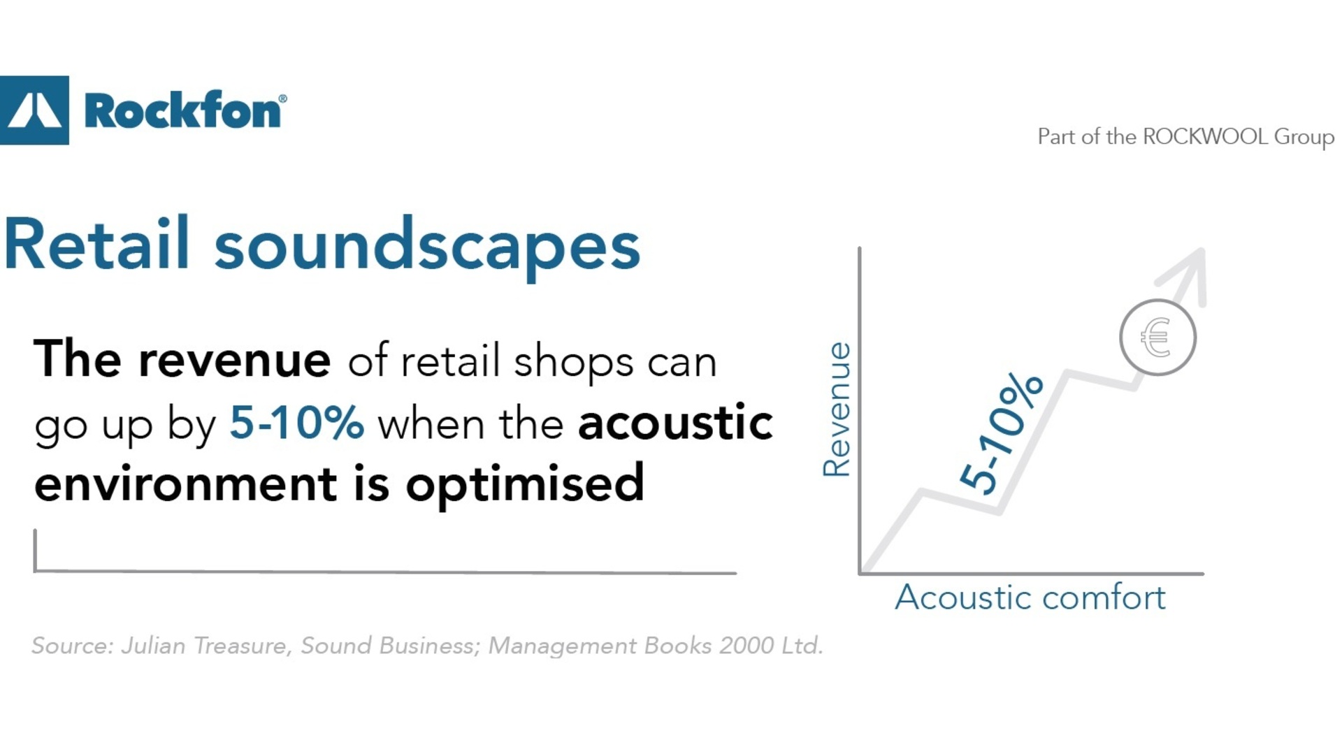 On the other hand, the revenue of retail shops can go up by 5-10 percent when the acoustic environment is optimised. In fact, a recent survey showed that 76 percent of respondents would dine out more often if the restaurants were more quiet3.