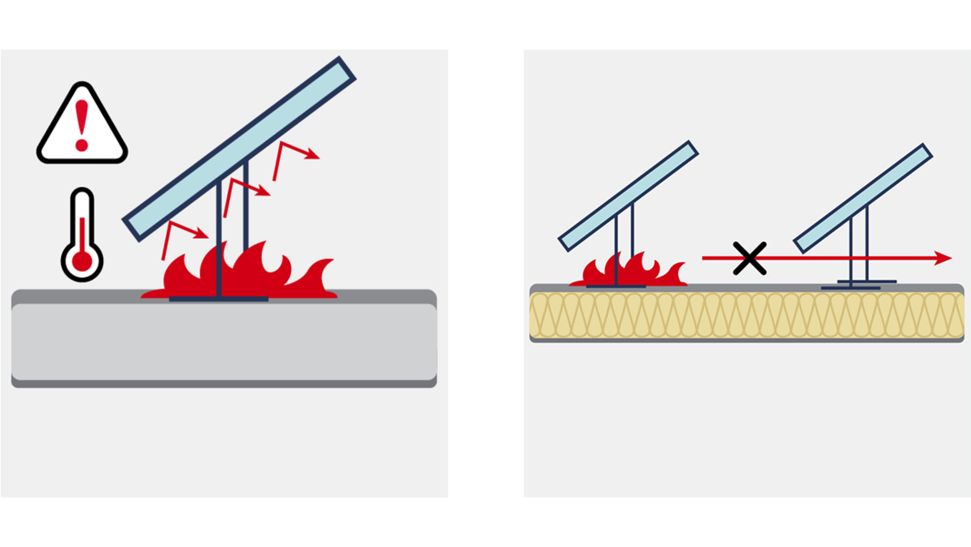 A tetőszerkezetek tűzvédelmi teljesítménye és tűzvédelmi osztálya belső oldali tűzhatásra vizsgáltak. Amennyiben a tetőn kigyullad a napelem vagy környezet az külső tűzhatásként fog jelentkezni! Ennek a tűzhatásnak jelentősen nagyobb lehet a mértéke, mint a Broof t1 röptűz elleni vizsgálat során használt tűzhatás. Ha tűz keletkezik a tetőn telepített napelemek alatt, a napelem a hőt visszasugározhatja az alatta lévő szerkezeti elemre, növekszik a tűzterhelés, a tűzterjedés kockázata valamint tűz intenzitása.