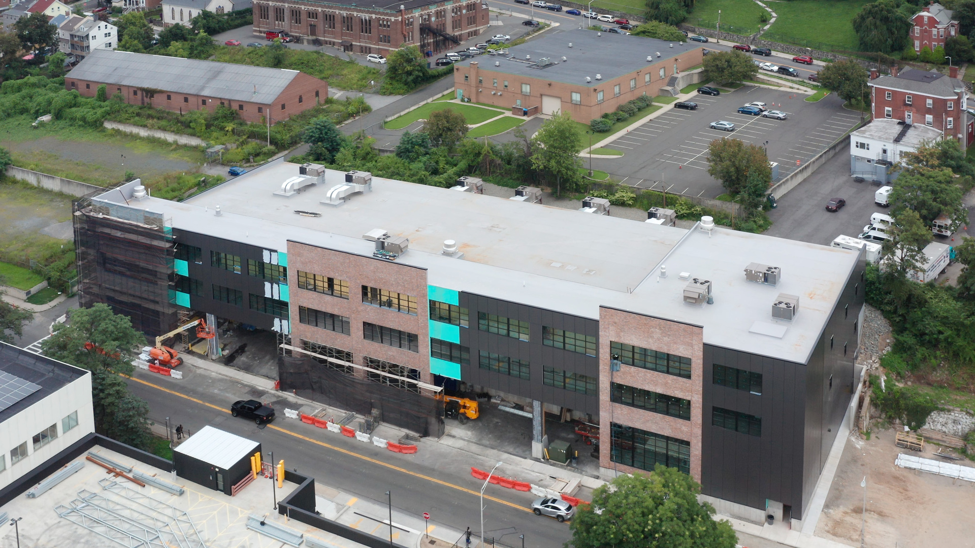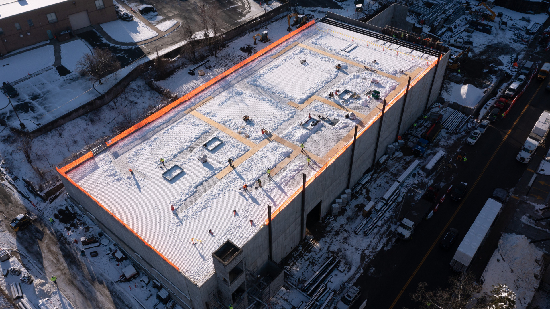 Nations Roof was contracted to roof a pair of studios by design-build firm Steve Pustola and Associates. The client—Lionsgate Studios—was constructing a 1,000,000+ ft2 campus of stages, office, support space, and city street backlots in Yonkers, New York. It is one of largest dedicated video and film production facilities on the East Coast. In 2021 with construction of the second sound stage underway, film crews working in the first completed studio space began noticing noise coming from the nearby train station. It was distracting enough—inside the sound stage the exterior sound levels were able to be picked up by the microphones during recording—that filming had to pause regularly. Interruptions in this line of work cost time and money. A new approach would be required for roofing the second sound stage.