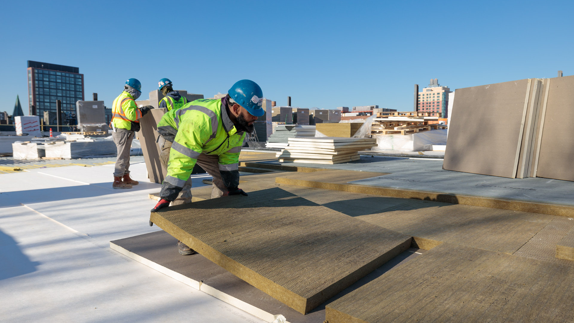 The typical installation on the first studio roof—two layers of polyisocyanurate insulation and a mechanically attached TPO roofing system—wasn’t effectively decreasing the exterior environmental sound transmission from passing trains. The new roof assembly would need to meet the acoustic requirements for the space while also providing effective water, air, and thermal control for durability of the roof over time.