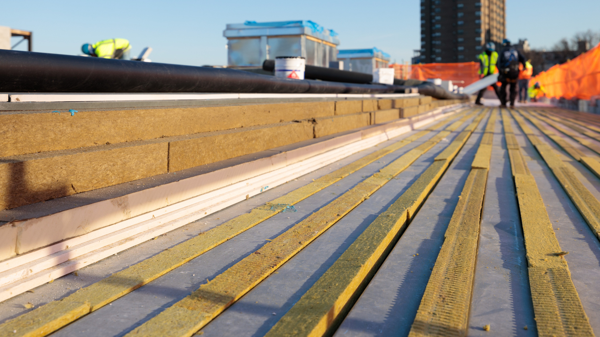 Toprock® DD is a compatible insulation board for all low-slope roof decks and is an ideal board for partial adhered roof systems. It has excellent acoustic properties. The product can be used as either a base layer of thermal insulation in an acoustic assembly under Multifix™ or Toprock® DD Plus, or as the top layer of a hybrid roof assembly over polyisocyanurate or other roof insulations, while ROCKWOOL Toprock® Flute Filler is designed to deliver high-performance sound absorption for standard metal roof deck profiles. Flute Filler is installed in the flute of a standard metal deck to absorb exterior noise and to minimize exterior noise reverberation within the voids of the roof deck.