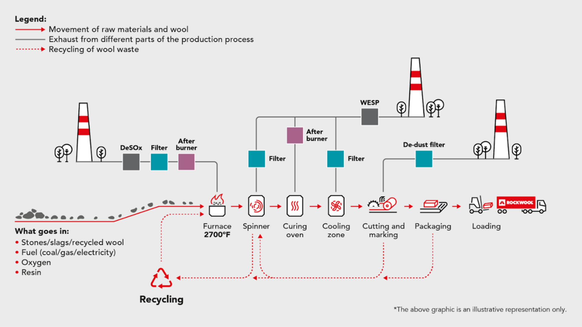 Stone wool, which is the end solution that we create, is also fully recyclable and can be recycled repeatedly without degrading its quality. Our production process has also been designed for zero production wastewater discharge to the environment. In fact, no production process wastewater is discharged into waterways or the ground at any of our ROCKWOOL factory locations.