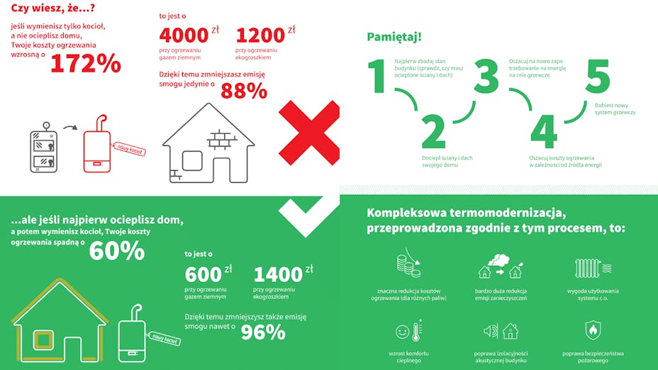 Rozpoczynając prace termomodernizacyjne, należy pamiętać o właściwej kolejności działań: najpierw ocieplamy, a potem dostosowujemy nowe źródło ciepła. Sama wymiana kotła nie wystarczy - spowoduje zmniejszenie smogu (jak podaje raport „Szóste Paliwo” – o 88%), jednak jeżeli będzie to jedyne działanie podjęte w walce ze smogiem, jego rezultatem będzie… bardzo duży wzrost kosztów za ogrzewanie.
